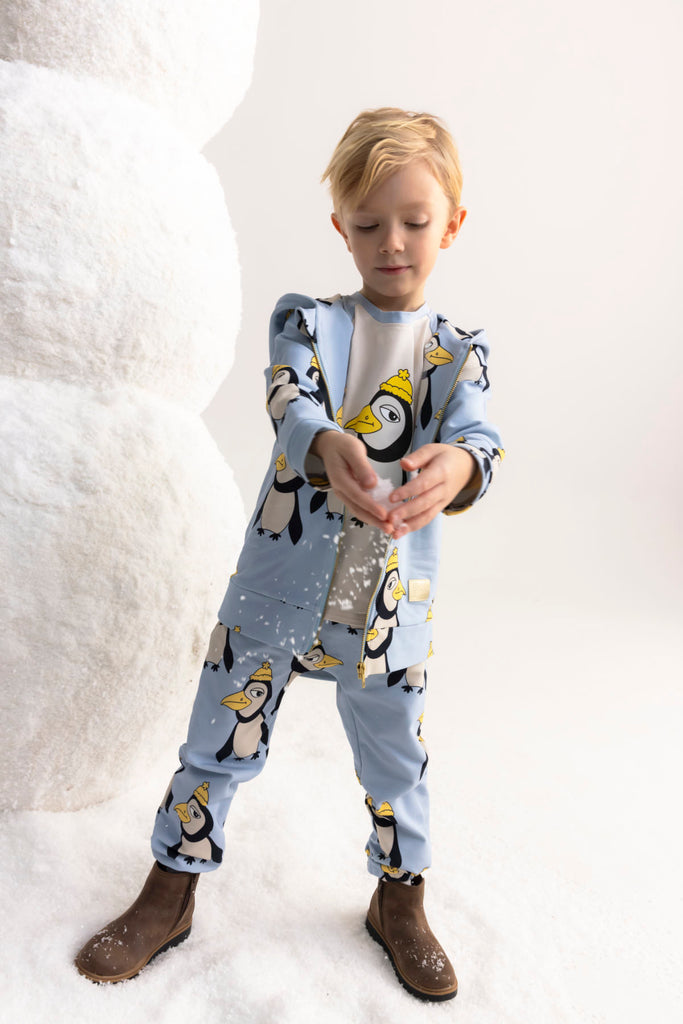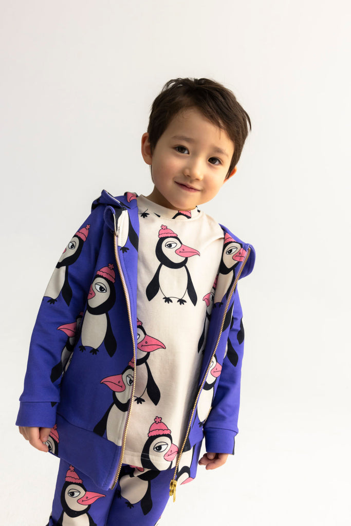 This playful unisex kids' hoodie comes in two charming colors: light blue featuring penguins with bright yellow hats and beaks, and violet showcasing penguins with cute pink hats and beaks. Soft and cozy, it’s perfect for keeping your child warm while adding a fun, cheerful touch to their outfit.