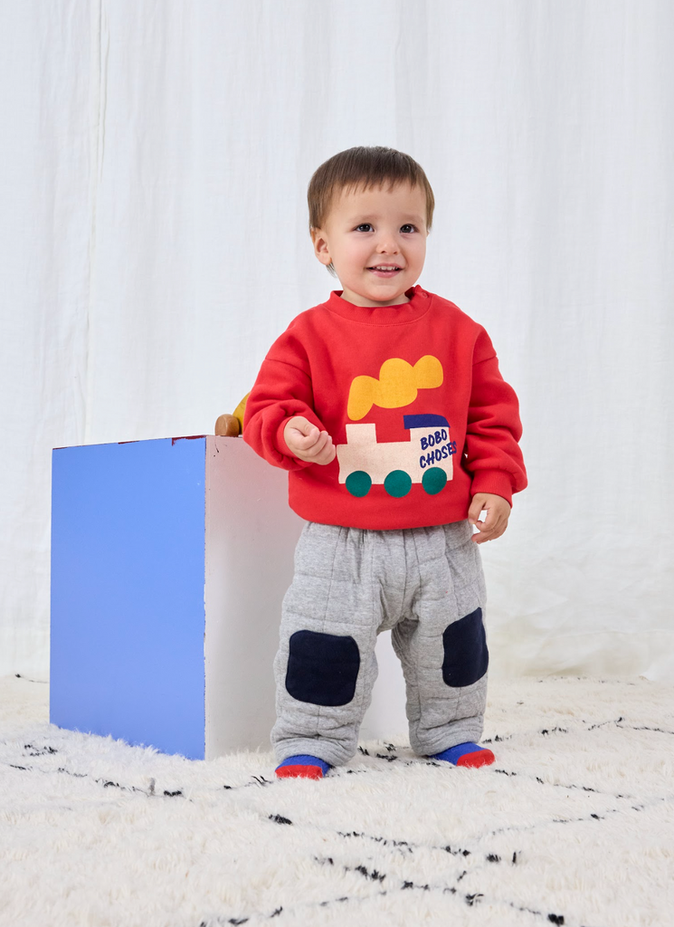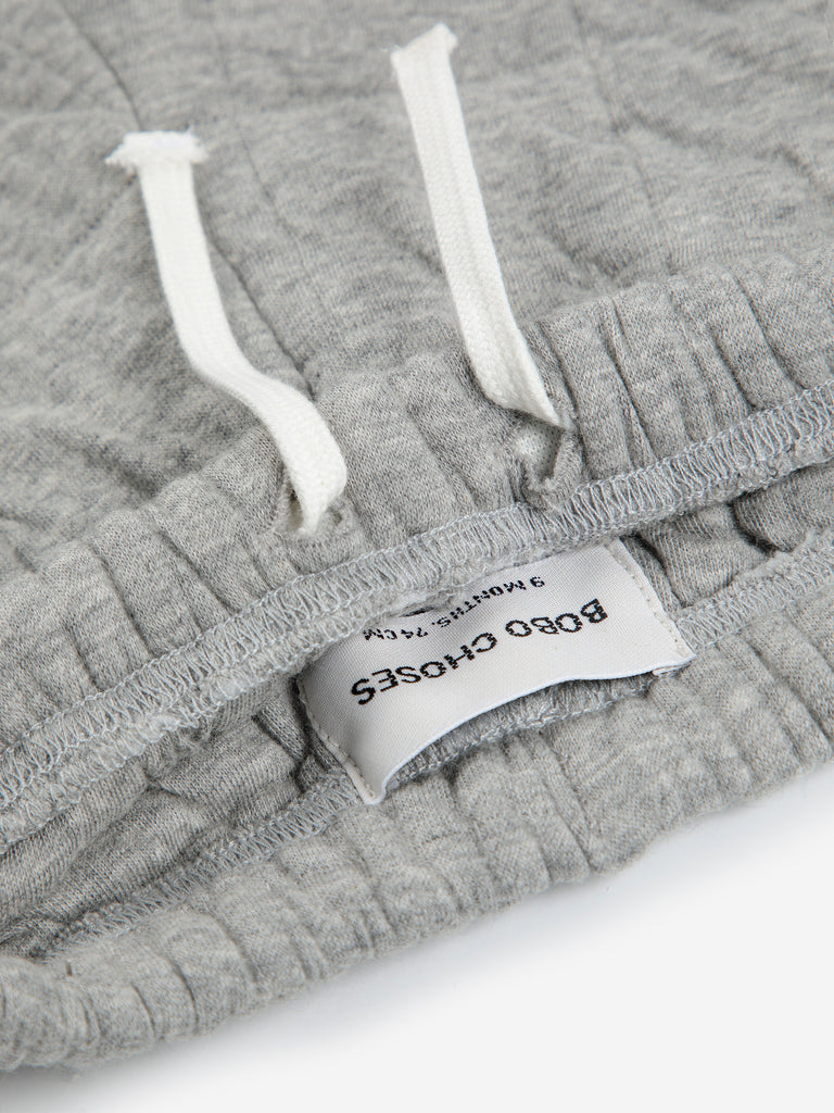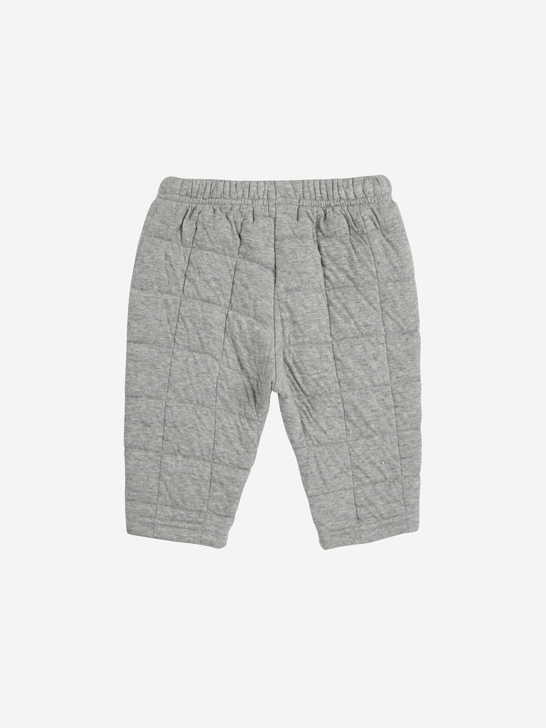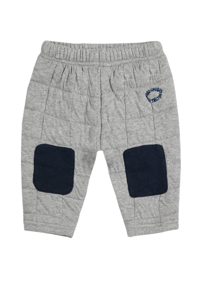Keep your little one cozy and stylish with these quilted baby joggers from Bobo Choses. Featuring a soft grey fabric accented by navy knee patches, they’re perfect for playful days and comfy naps. Designed for easy movement and extra durability, these joggers make every adventure a little more fun!
